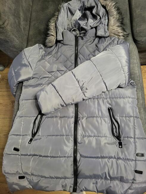 Sprzedam kurtkę zimową z kapucyną w kolorze popielatym Rozmiar pod pachami 126cm i w pasie 126cm